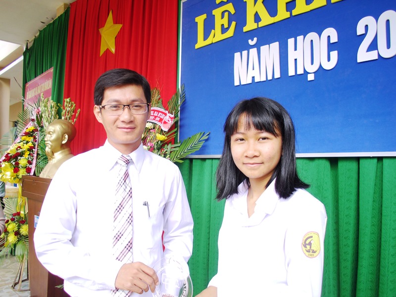 Anh Nguyễn Hữu Hoàng và cô Phan Vũ Anh Phong, đại diện Hội cựu học sinh trao phần thưởng của Hội cho học sinh đạt tiêu chí: Học sinh xuất sắc nhất khối 10, 11 trong năm học 2014-2015.